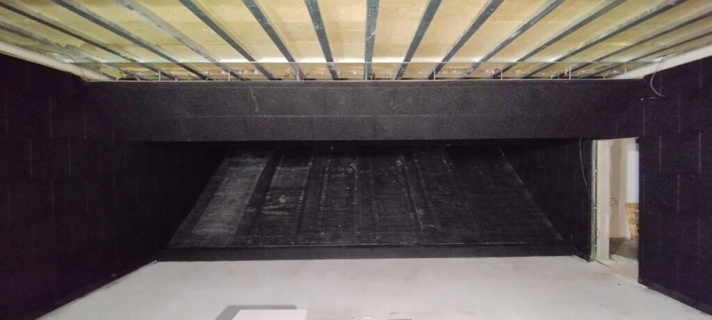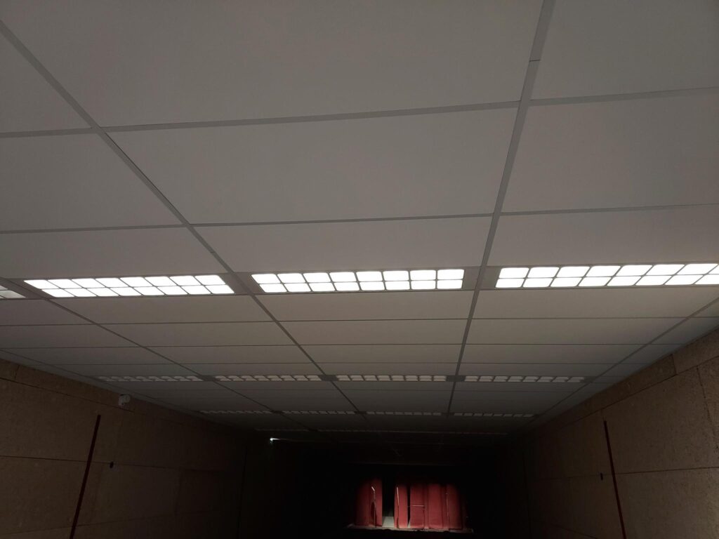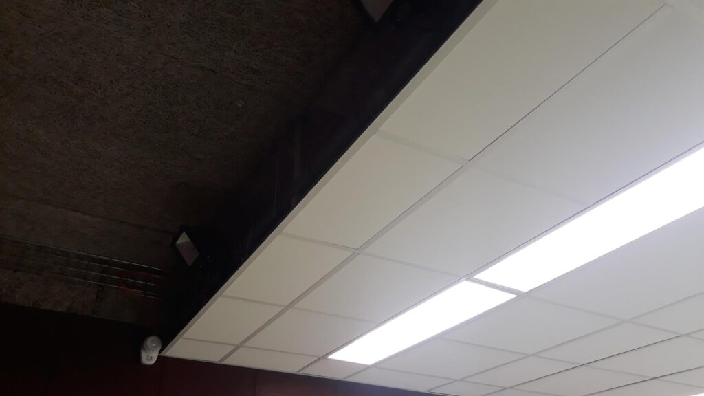 The acoustic false ceiling is the first element entering the acoustic chain in the shooting range. It is composed of false ceiling tiles of 600 x 600mm, thickness 40mm with Alpha Sabine acoustic absorption coefficient greater than 0.8. The solution is mounted on mechanically fixed aluminum profile.