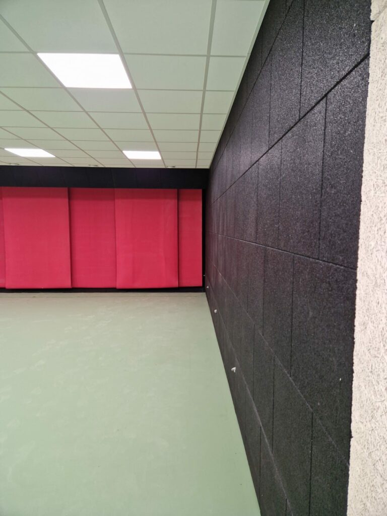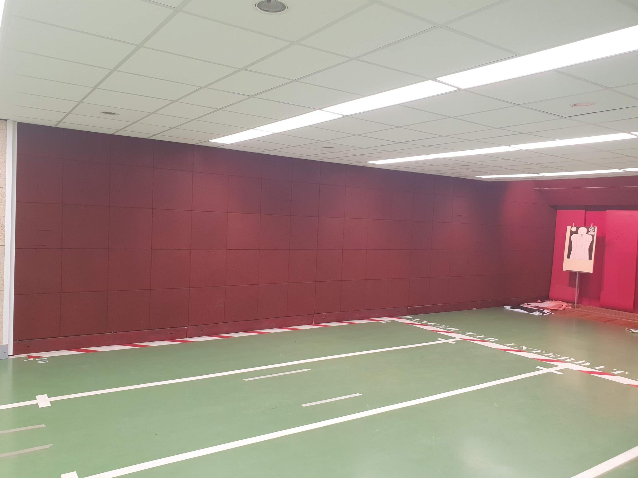 The ballistic walls with rubber blocks were specifically developed to allow firing at 180° on the walls in front of the bullet trap.
