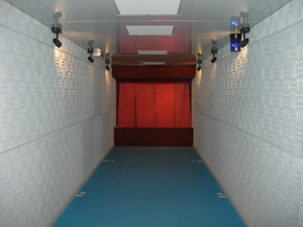 - Structure : châssis de remorque de camion conventionnel avec carrosserie blindée, escalier métallique pour l’accès, ventilation, air conditionné (en option), vérins hydrauliques (en option), revêtement de sol anti-retour et dalles acoustiques dans le stand de tir.